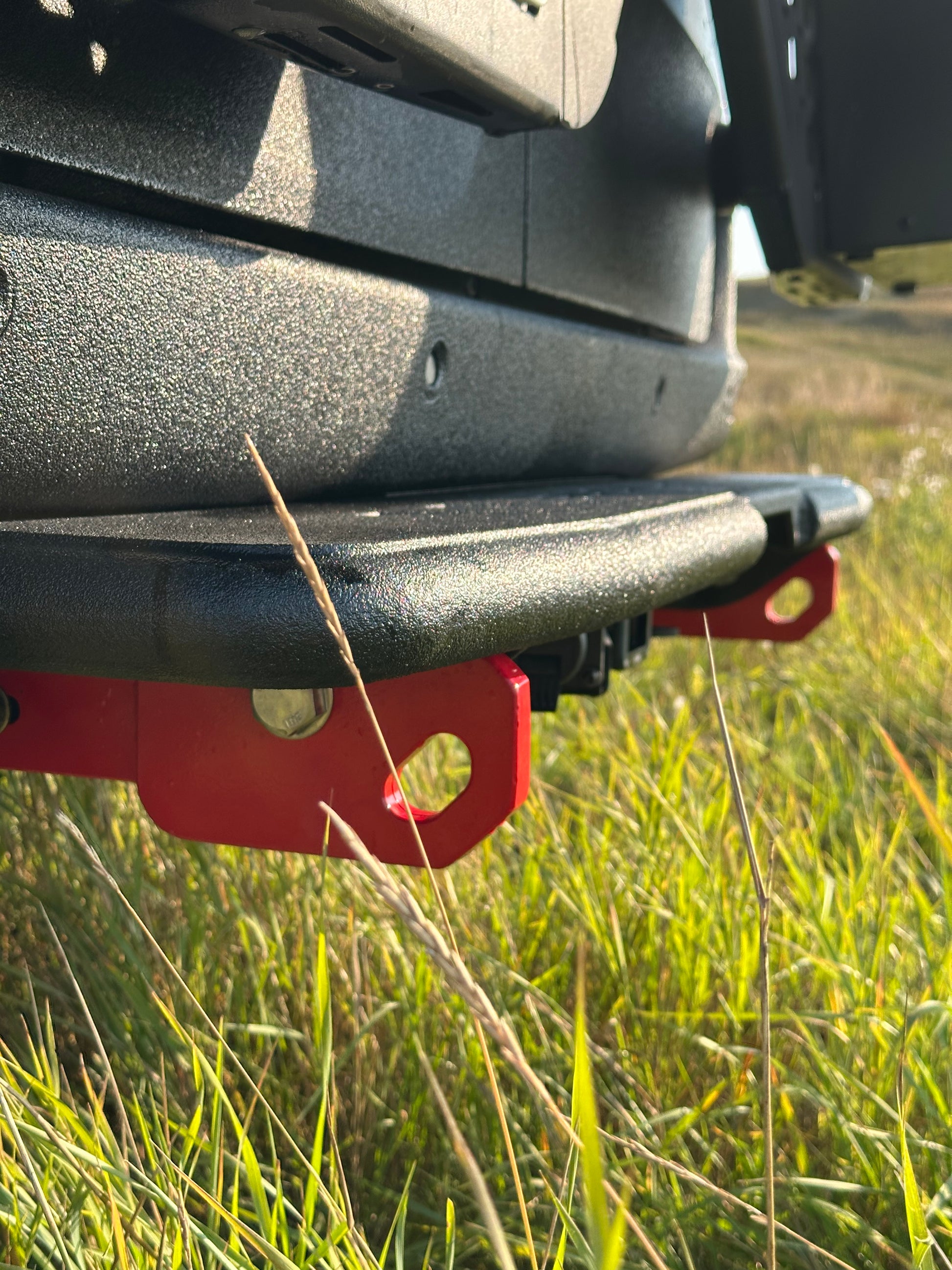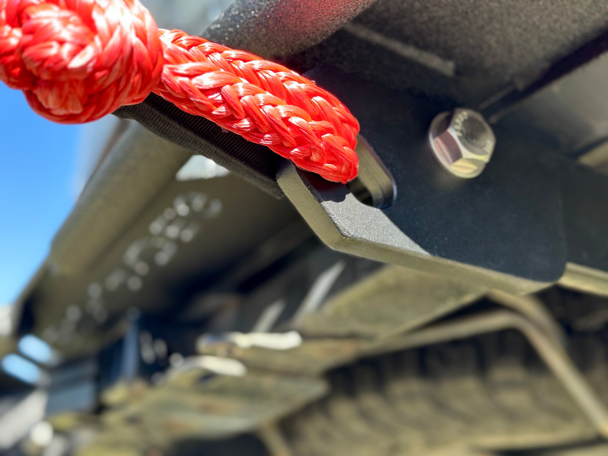 On both 144” and 170” wheelbase Sprinter vans, the tow hitch often contacts the ground when crossing ditches or uneven terrain — these recovery points add valuable protection, preventing damage to the finish of your rear step while maintaining full towing capability. Not compatible with steel shackles only to be used with soft shackles or ropes.