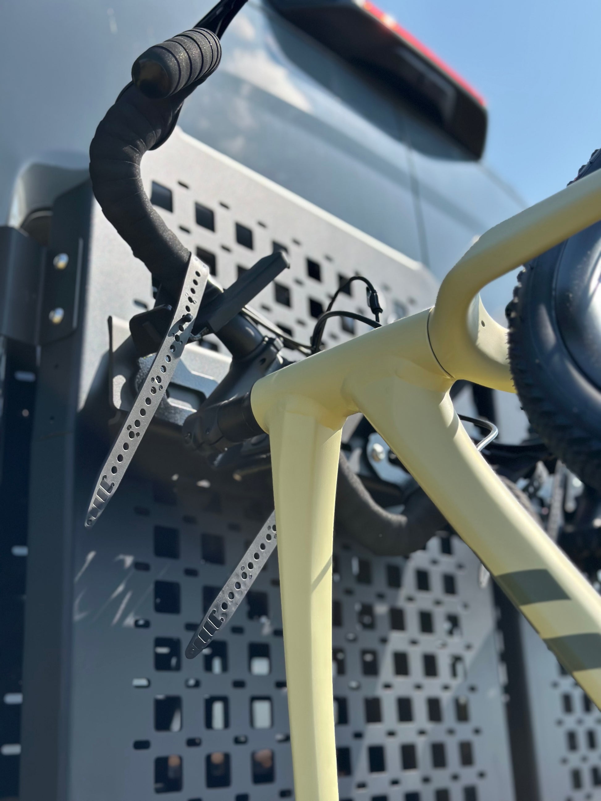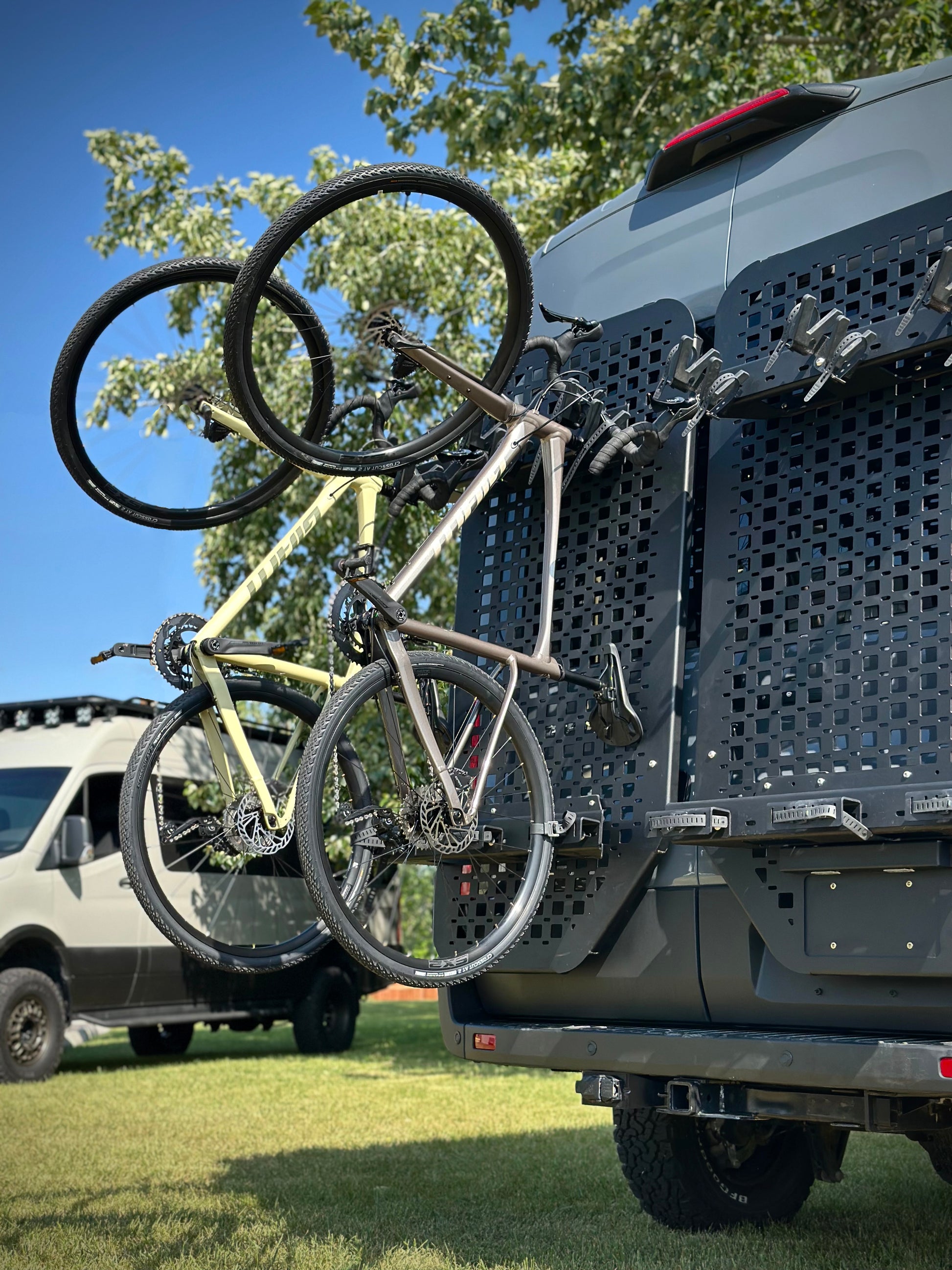 We teamed up with the experts at Mammoth Mounts to bring this idea to life. While some people prefer storing bikes inside their vans, the OX bike rack is perfect for carrying bikes when they’re too dirty for the inside or when you need extra interior space.