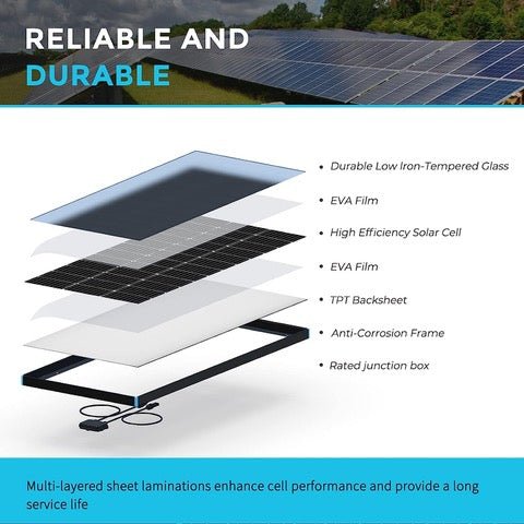 Experience efficiency and durability with our Renogy 100W 12V solar panel, meticulously crafted using high-purity monocrystalline silicon cells. Through multi-layered lamination technology, we've ensured this panel provides optimal conversion rates.