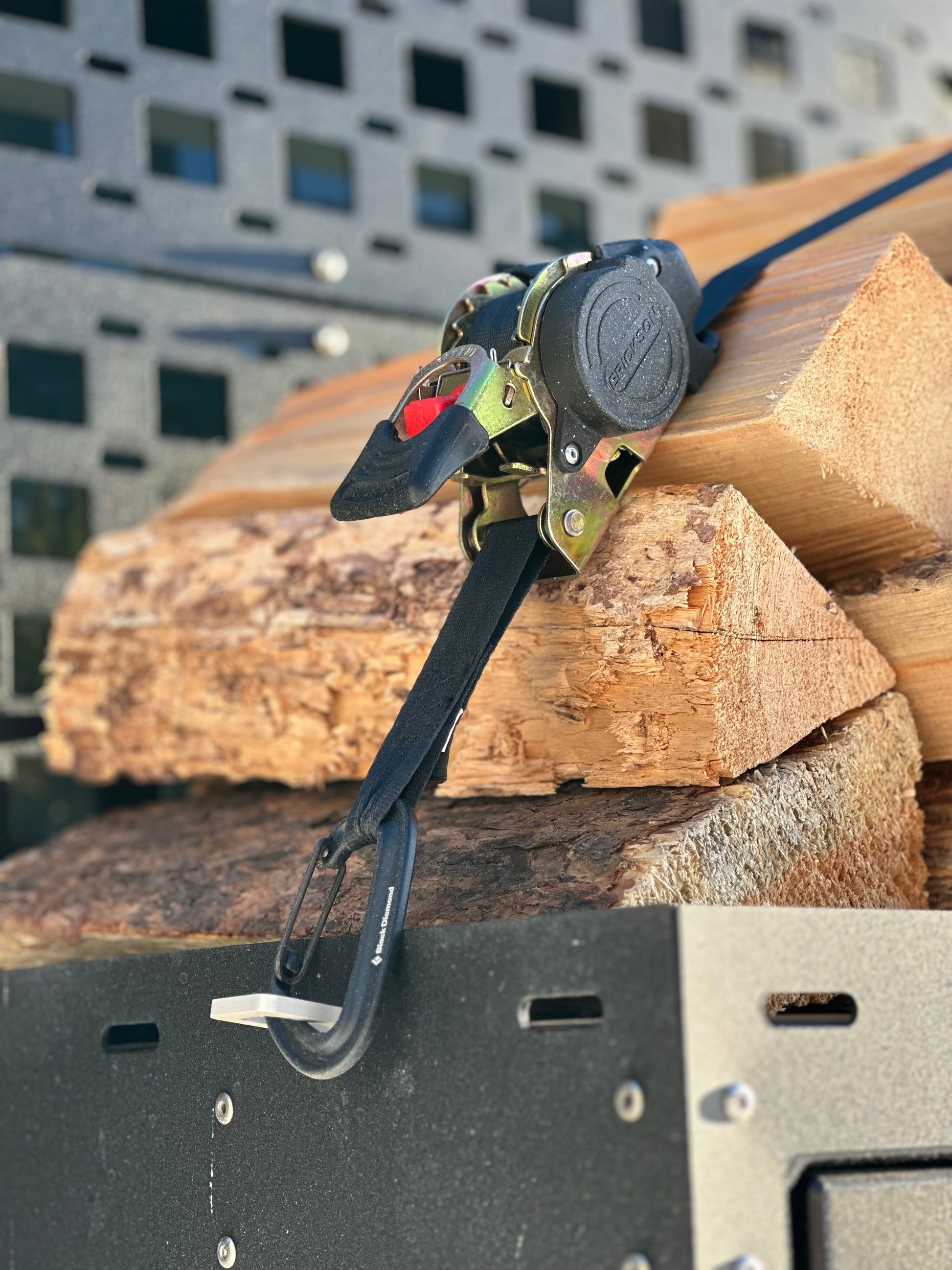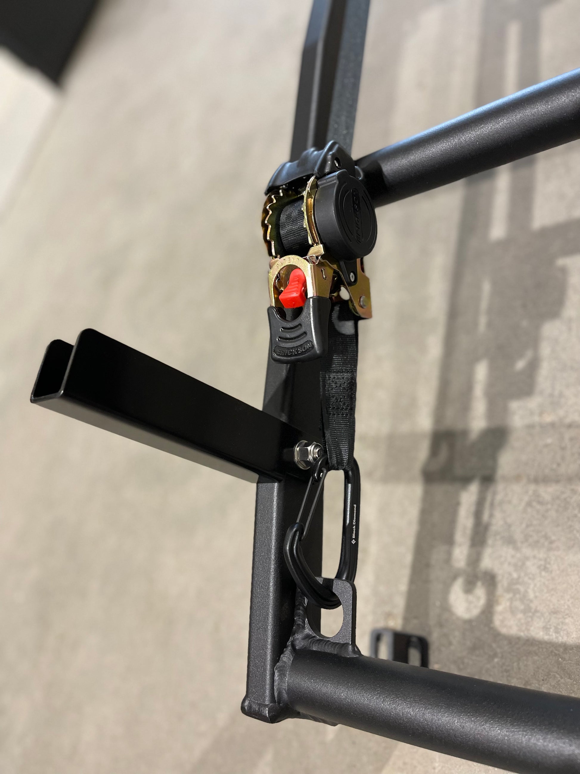 This Tie-Down Ratchet Strap with Carabiners was designed to perfectly suit our IBEX ladder system and Ox Box, making carrying equipment a breeze. Use it with the IBEX Ladder utility shelves to easily transport paddle boards, surf boards, and even plywood for your van build! It can also securely hold firewood and generators on the Ox Box. This versatile tool streamlines your transport process and simplifies your outdoor adventures with ease!
