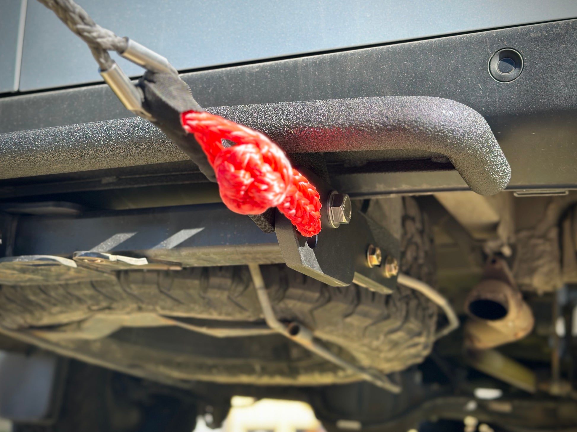 On both 144” and 170” wheelbase Sprinter vans, the tow hitch often contacts the ground when crossing ditches or uneven terrain — these recovery points add valuable protection, preventing damage to the finish of your rear step while maintaining full towing capability. Not compatible with steel shackles only to be used with soft shackles or ropes.